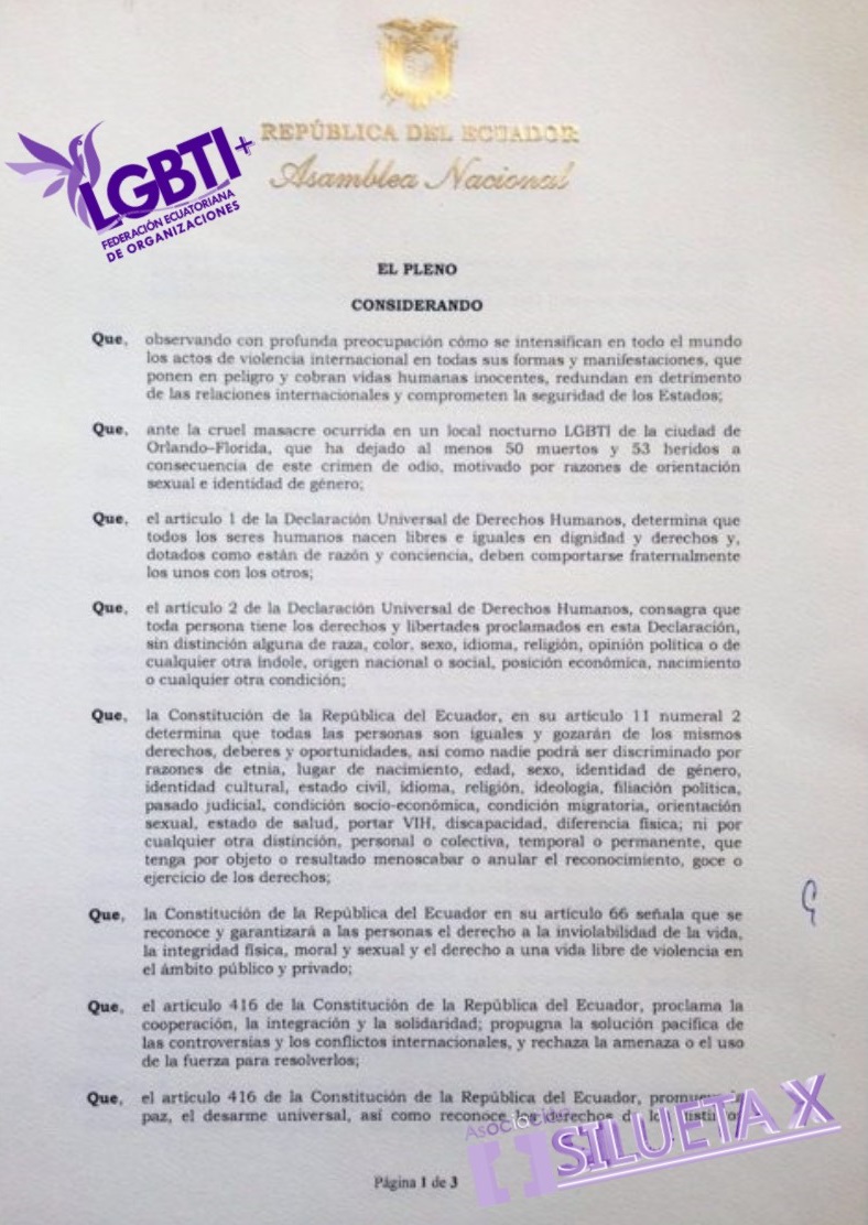 Resolución del reconocimiento 27 de Noviembre 2016 como el día Nacional de las Diversidades Sexo Genéricas LGBT Ecuador – Gracias a la Federación ecuatoriana de organizaciones LGBT y Asoc. Silueta X