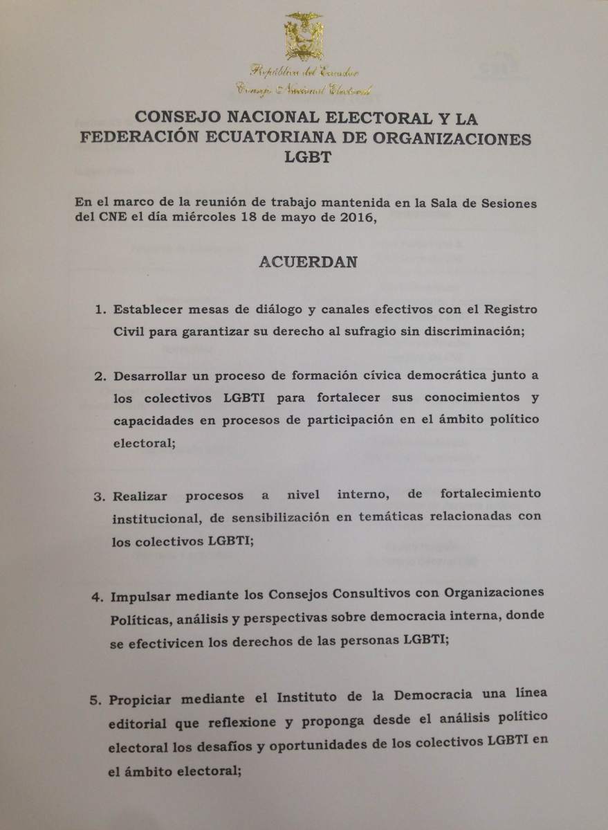 Acta del acuerdo entre consejo nacional electoral y federacion ecuatoriana de organizaciones lgbt Publicado 5 septiembre, 2016 en 2391 × 3264 en CONSEJO NACIONAL ELECTORAL Y FEDERACIÓN LGBTI FIRMAN ACUERDOS LGBTI ← Anterior Siguiente →