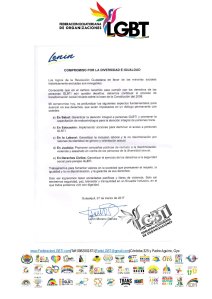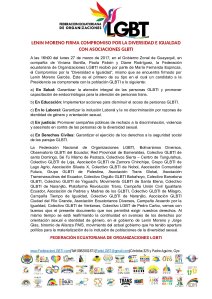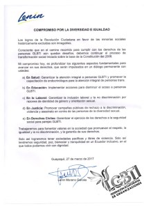 A las 16h00 del lunes 27 de marzo de 2017, en el Gobierno Zonal de Guayaquil, en compañía de Viviana Bonilla, Paola Pabón y Diane Rodríguez, la Federación ecuatoriana de Organizaciones LGBTI recibió por parte de María Fernanda Espinoza, el Compromiso por la “Diversidad e Igualdad”, mismo que se encuentra firmado por Lenin Moreno Garcés. Este es el primero de su tipo en el cual un candidato a la Presidencia se compromete con la población GLBTI a lo siguiente: