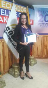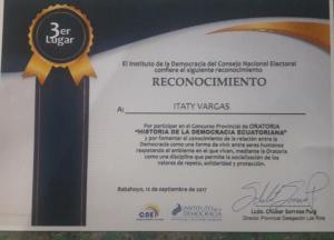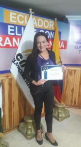 La representante del colectivo Federado Orgullo GLBTI de Babahoyo, los Ríos, Itaty Vargas, recibió un reconocimiento por su dicción y oratoria por parte del instituto de la democracia del CNE.