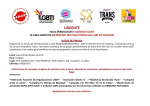 Después de la marcha de desinformación y odio #ConMisHijosNoTeMetas , ante el reciente brote de violencia, el asesinato hace un día de una compañera Trans y las nuevas amenazas de un grupo aparentemente de exterminio Neo-Nazi en Ecuador contra LGBT convocamos a los medios para manifestar nuestra preocupación y rechazar el silencio de las Autoridades:
