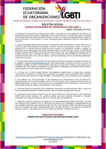 La Federación ecuatoriana de organizaciones LGBTI, constituida el 15 de septiembre de 2015 en la Asamblea Nacional del Ecuador y legalizada el 20 de Enero del 2017 a través del acuerdo ministerial #1419 del Ministerio de Justicia Derechos Humanos y Cultos, con más de 68 organizaciones en cada una de sus provincias a nivel nacional y la única de segundo grado oficialmente, pone en conocimiento lo siguiente:
