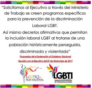 “Solicitamos al Ejecutivo a través del Ministerio de Trabajo se creen programas específicos para la prevención de la discriminación Laboral LGBT.