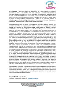 “Invitamos a que el Presidente se pronuncie ante la reciente sentencia a nuestro favor en orientación sexual e identidad de género, por parte de la Corte Interamericana de Derechos Humanos. Así como exigió y presionó a la Corte Constitucional de Ecuador a que se pronuncie sobre la Consulta Popular, que se pronuncie y presione a la misma Corte sobre el caso Satya y el Matrimonio Homosexual”, exigió Gretty Gonzalez, presidenta del Colectivo de Mujeres Lesbianas del Ecuador.
