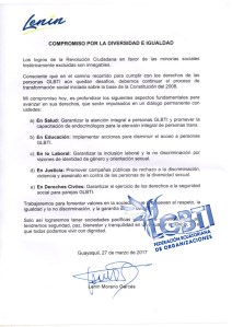 En una rueda de prensa en la Casa Legislativa del Guayas, la Asambleísta Nacional y defensora de los derechos de la población LGBTI del Ecuador, Psic. Diane Rodríguez, manifestó que el gobierno nacional firmó un acuerdo en avances de Salud, Educación, Empleo y Justicia el 27 de marzo de 2017, cuando el actual presidente de Ecuador, era candidato.