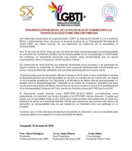 La Federación ecuatoriana de organizaciones LGBTI, la Asociación Silueta X y la Fundación Niñez y adolescencia trans, reconoce el accionar positivo de la Organización Mundial de la Salud OMS, por haber excluido de sus apartados de trastornos de la sexualidad, la transexualidad.