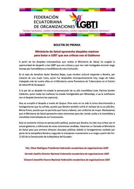 A partir de los despidos intempestivos que realiza el Ministerio de Salud, ha surgido la oportunidad de despedir a los LGBT que son críticos y que han sido hostigados durante largo tiempo por homofóbicos y transfóbicos de esta institución.