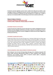 Finalmente queremos agradecer quienes hicieron posible este trabajo del cual saldrá un plan estratégico nacional y una agenda de acciones, que poco a poco pondremos en conocimiento. Al Consejo de Protección de Derechos de Santo Domingo de los Tsáchilas por su apoyo y apertura y a los Colectivos LGBT de Santo Domingo quienes fueron excelentes anfitriones.