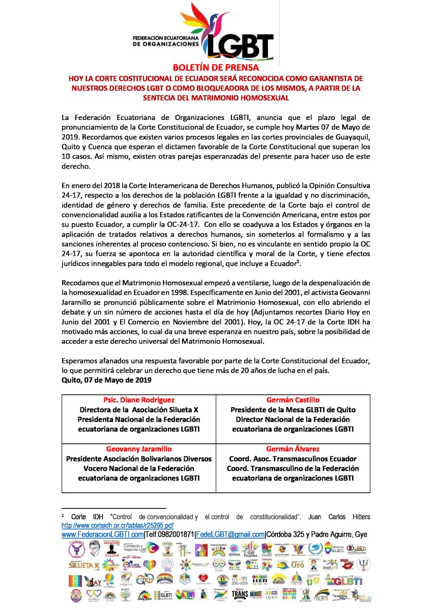 Boletín de Prensa – HOY LA CORTE COSTITUCIONAL DE ECUADOR SERÁ RECONOCIDA COMO GARANTISTA DE DERECHOS LGBT O COMO BLOQUEADORA, A PARTIR DE LA SENTENCIA DEL MATRIMONIO HOMOSEXUAL 1 (2)