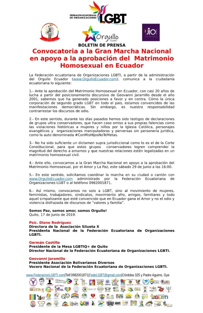 1.- Ante la aprobación del Matrimonio Homosexual en Ecuador, con casi 20 años de lucha a partir del posicionamiento discursivo de Geovanni Jaramillo desde el año 2001, sabemos que ha generado posiciones a favor y en contra. Cómo la única corporación de segundo grado LGBT en todo el país, estamos convencidos de las manifestaciones democráticas. Sin embargo, es nuestra responsabilidad contrarrestar los discursos de odio.