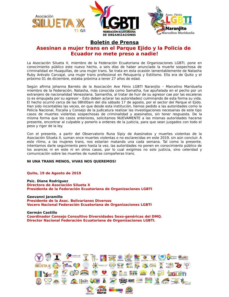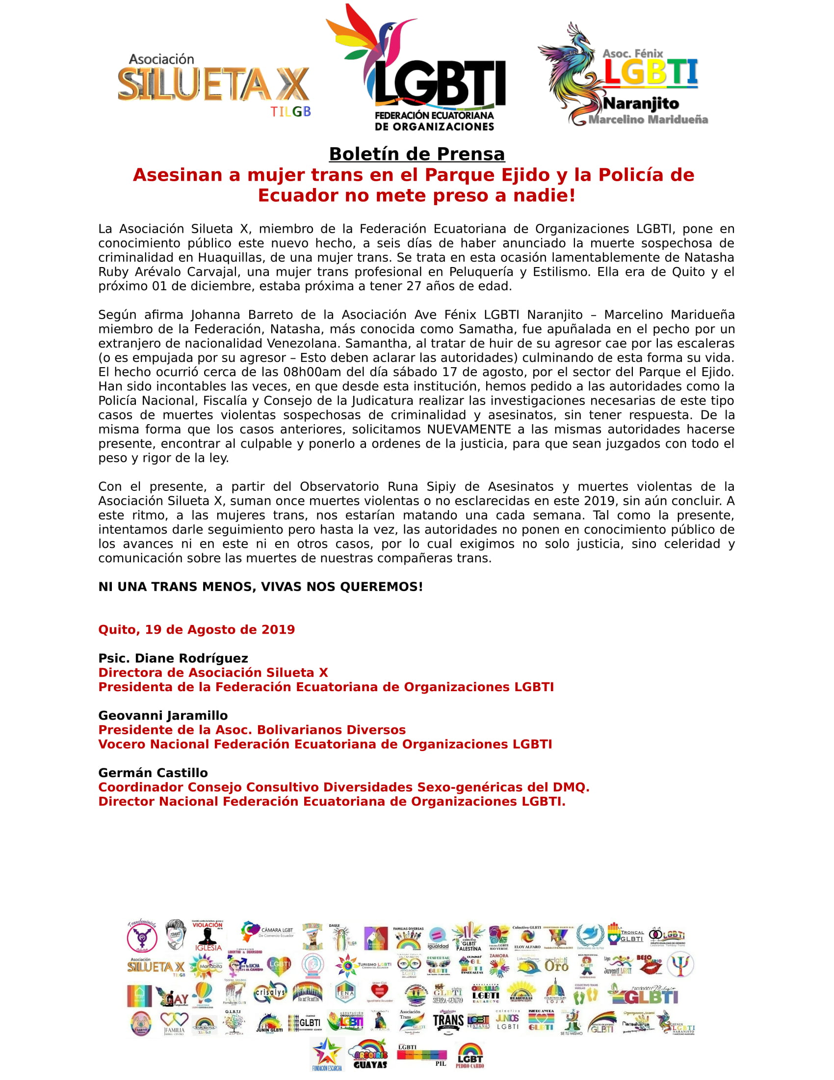 Asesinan a mujer trans en Parque El Ejido y nadie va preso en Ecuador – Asociación SIlueta X – Federación Ecuatoriana de Organizaciones LGBTI-1 Publicado 19 agosto, 2019 en 1700 × 2200 en Asesinaron a mujer trans en el Parque Ejido y la Policía de Ecuador no mete preso a nadie! ← Anterior