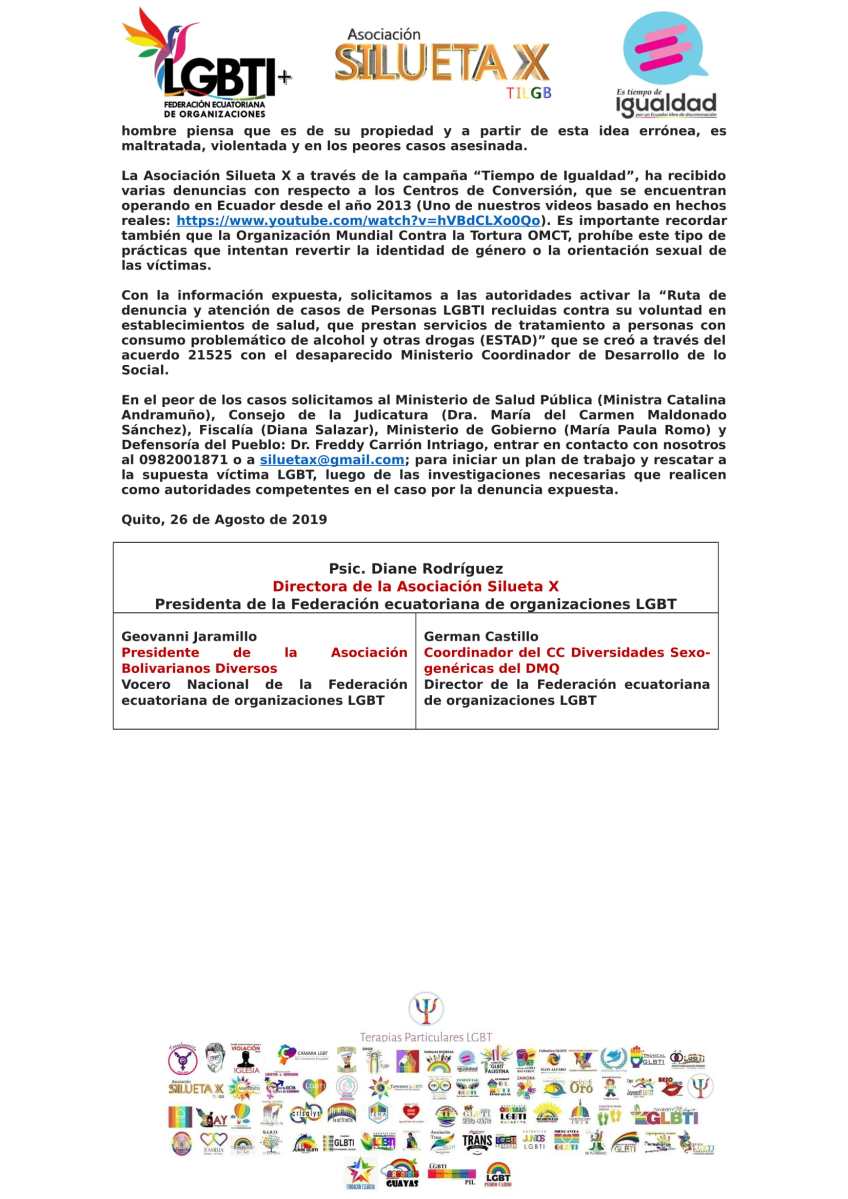 Alerta a las Autoridades ante posible rapto en Centro de Conversión o de tortura LGBT – Asociación Silueta X – Centro Psico Trans Ecuador – federación-2