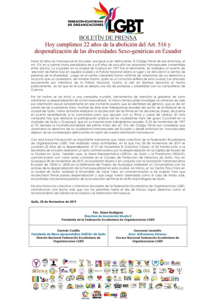 Con esta breve introducción es importante mencionar que varios colectivos de la Federación Ecuatoriana de Organizaciones LGBTI, han realizado varias actividades, en la que hoy 28 de Noviembre de 2019 se cumplen 22 años de la despenalización. El 27 de Noviembre El Colectivo Crisalys, Es Mi Familia junto a la Secretaría de Inclusión realizaron un acto conmemorativo por la despenalización en la Capilla del Museo de la Ciudad en Quito. También ayer, la Mesa Representativa LGBTIQ+ de Quito y la Plataforma ORGUIO, conmemoraron con varios actos culturales en el Consejo de Protección de Derechos de Quito. Hoy en Guayaquil 28 de Noviembre de 2019, la Asociación Silueta X en conjunto con la Asociación Transmasculinos Ecuador de 10h00 a 12h00 en la Defensoría del Pueblo de Guayaquil, realizarán un Conversatorio con los actores de la despenalización de la homosexualidad en esta ciudad. Así mismo, el 1er Centro Psico Trans en la ciudad de Quito, realizará el Encendido de Velas Trans, en conmemoración a las mujeres trans que recolectaron firmas parala despenalización y que luego fueron asesinadas como el caso de María José, encontrada una semana posterior de la recolección de firmas en el Río Machángara de Quito.