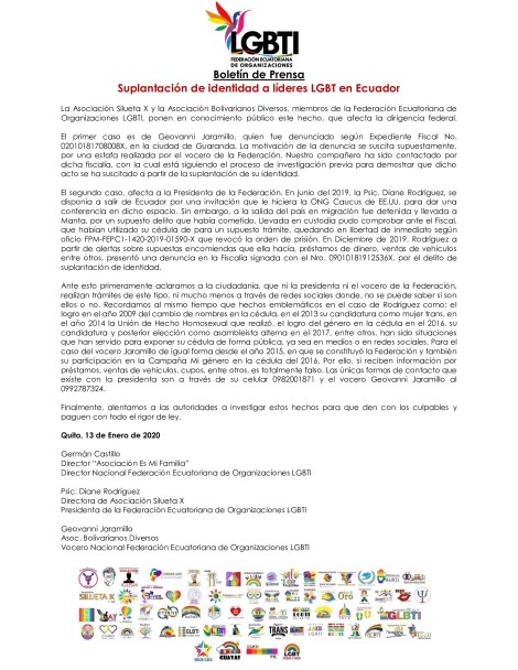 La Asociación Silueta X y la Asociación Bolivarianos Diversos, miembros de la Federación Ecuatoriana de Organizaciones LGBTI, ponen en conocimiento público este hecho, que afecta la dirigencia federal.