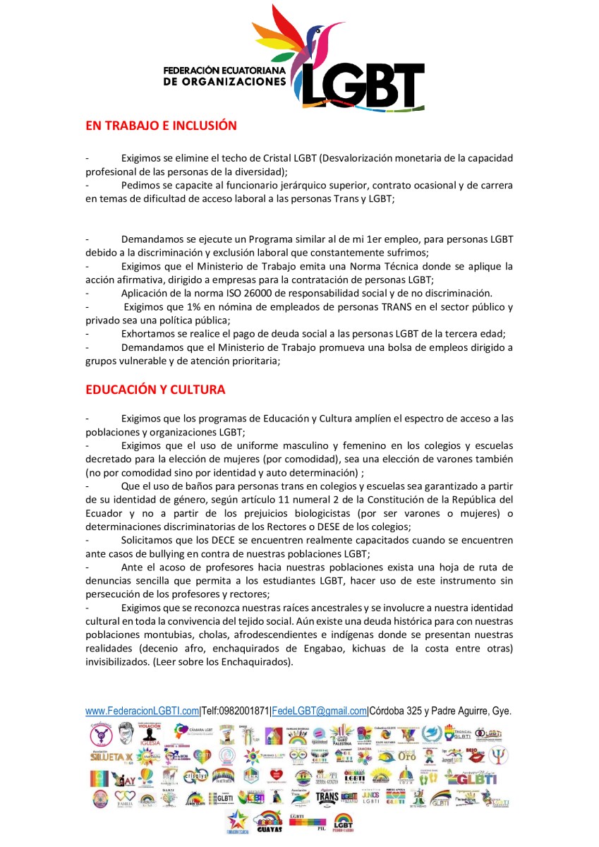 Manifiesto – 5to Encuentro Nacional de Poblaciones Sexo Diversas – Federación Ecuatoriana de Organizaciones LGBT 1 Publicado 18 febrero, 2020 en 1654 × 2339 en MANIFIESTO LGBT DE LA 5TA ASAMBLEA NACIONAL Siguiente →