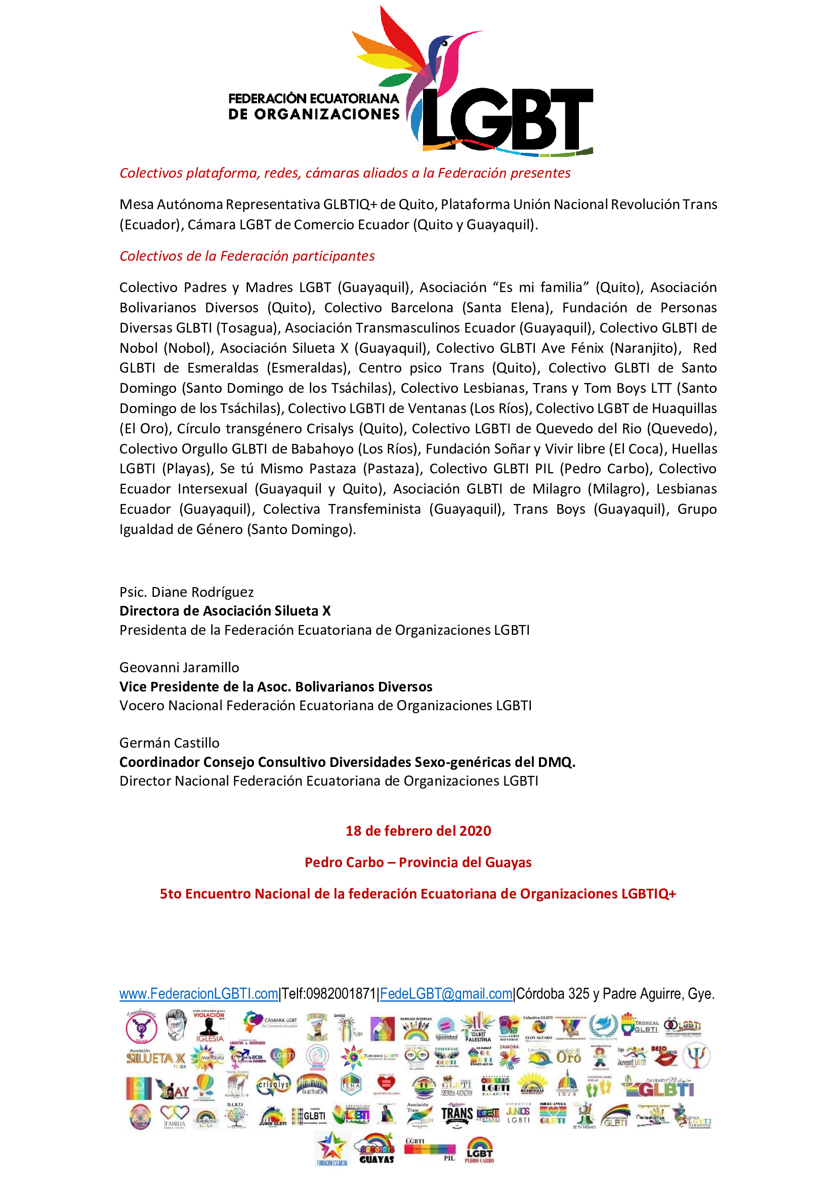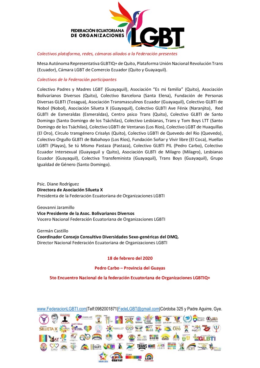 Manifiesto – 5to Encuentro Nacional de Poblaciones Sexo Diversas – Federación Ecuatoriana de Organizaciones LGBT 3 Publicado 18 febrero, 2020 en 1654 × 2339 en MANIFIESTO LGBT DE LA 5TA ASAMBLEA NACIONAL ← Anterior Siguiente →