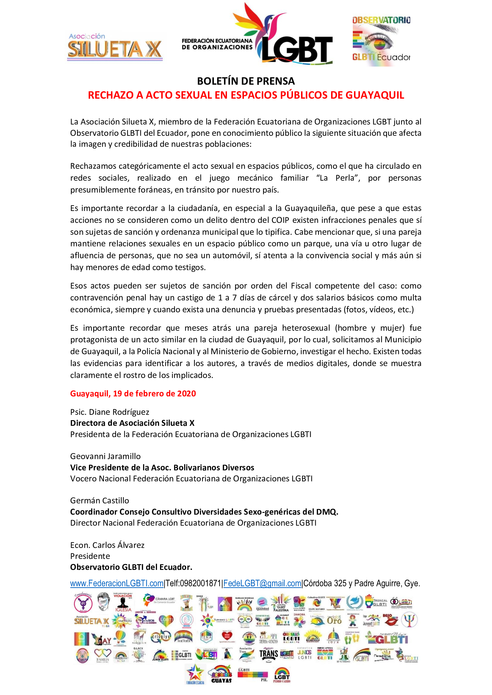RECHAZO-A-ACTO-SEXUAL-EN-ESPACIOS-PÚBLICOS-DE-GUAYAQUIL-Federación-Ecuatoriana-de-Organizaciones-LGBT Publicado 19 febrero, 2020 en 1654 × 2339 en BOLETÍN DE PRENSA; RECHAZO A ACTO SEXUAL EN ESPACIOS PÚBLICOS DE GUAYAQUIL Siguiente →
