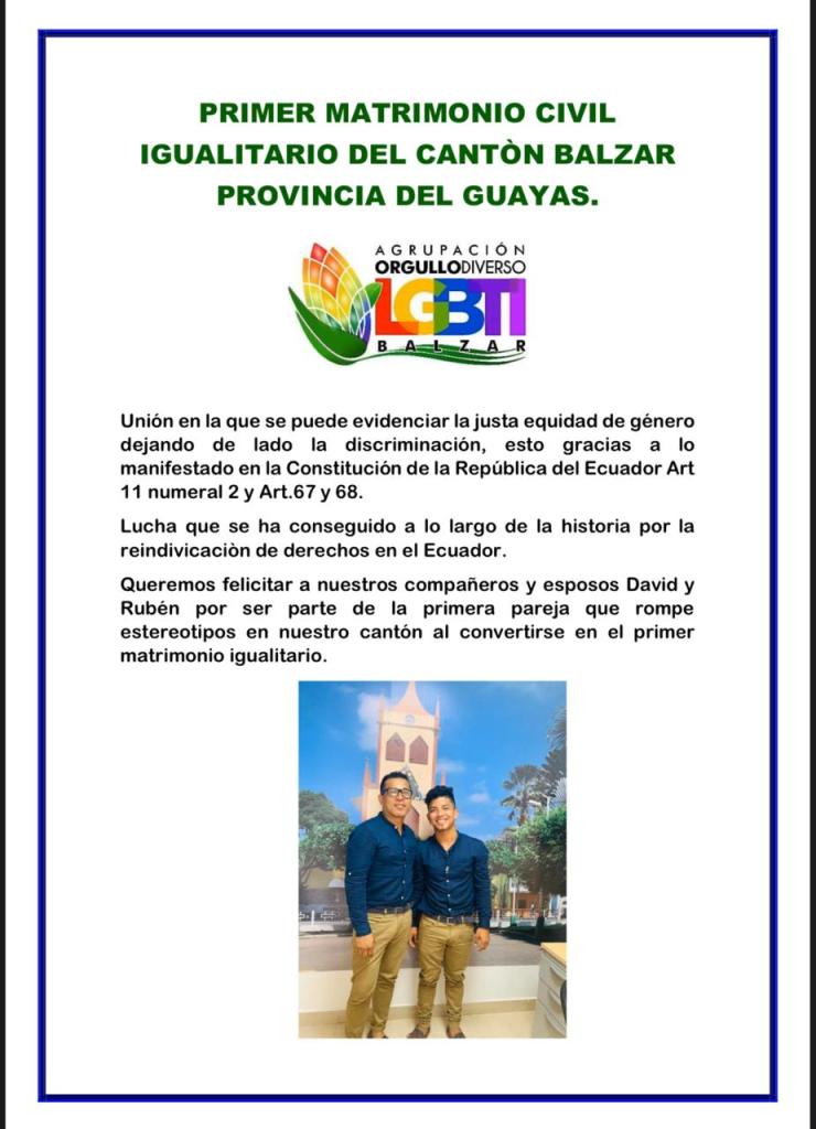 Queremos felicitar a nuestros compañeros y esposos David y Ruben por ser parte de la primera pareja que rompe estereotipos en nuestro cantón al convertirse en el primer matrimonio igualitario.