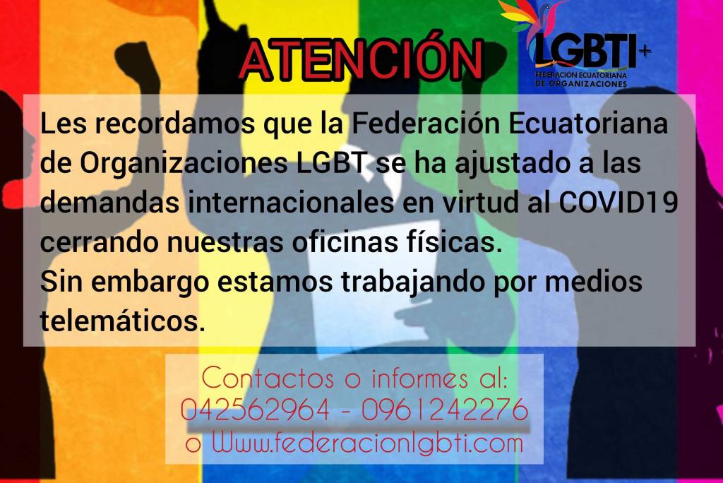 Les recordamos que la Federación Ecuatoriana de Organizaciones LGBT se ha ajustado a las demandas Internacionales en virtud del COVID19 cerrando nuestras oficinas físicas. Sin embargo estamos trabajando por medios telematicos.
