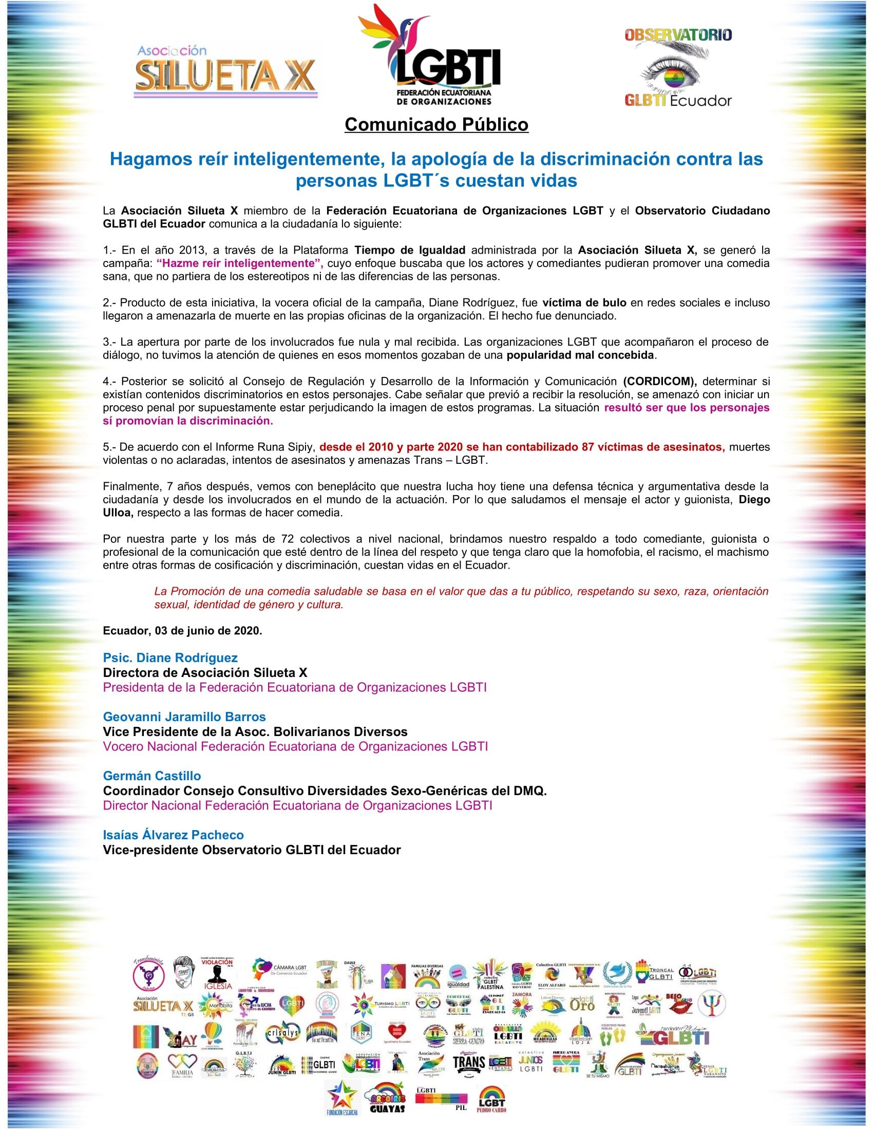 Comunicado Público – Hagamos reír inteligentemente, la apología de la discriminación contra las personas LGBT´s cuestan vidas – Asociación Silueta X – federación Ecuatoriana de Organizaciones LGBT