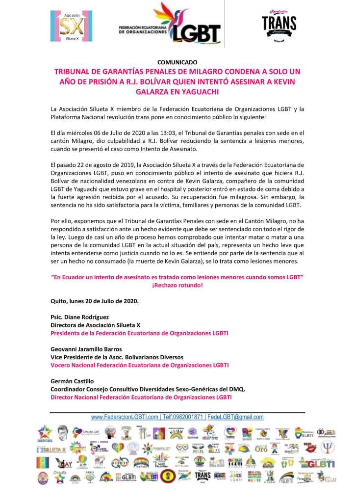 Por ello, exponemos que el Tribunal de Garantías Penales con sede en el Cantón Milagro, no ha respondido a satisfacción ante un hecho evidente que debe ser sentenciado con todo el rigor de la ley. Luego de casi un año de proceso hemos comprobado que intentar matar o matar a una persona de la comunidad LGBT en la actual situación del país, representa un hecho leve que intenta entenderse como justicia cuando no lo es. Se entiende por parte de la sentencia que al ser un hecho no consumado (la muerte de Kevin Galarza), se lo trata como lesiones menores.
