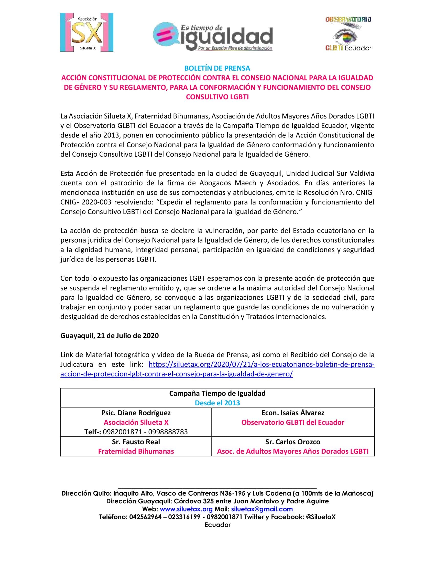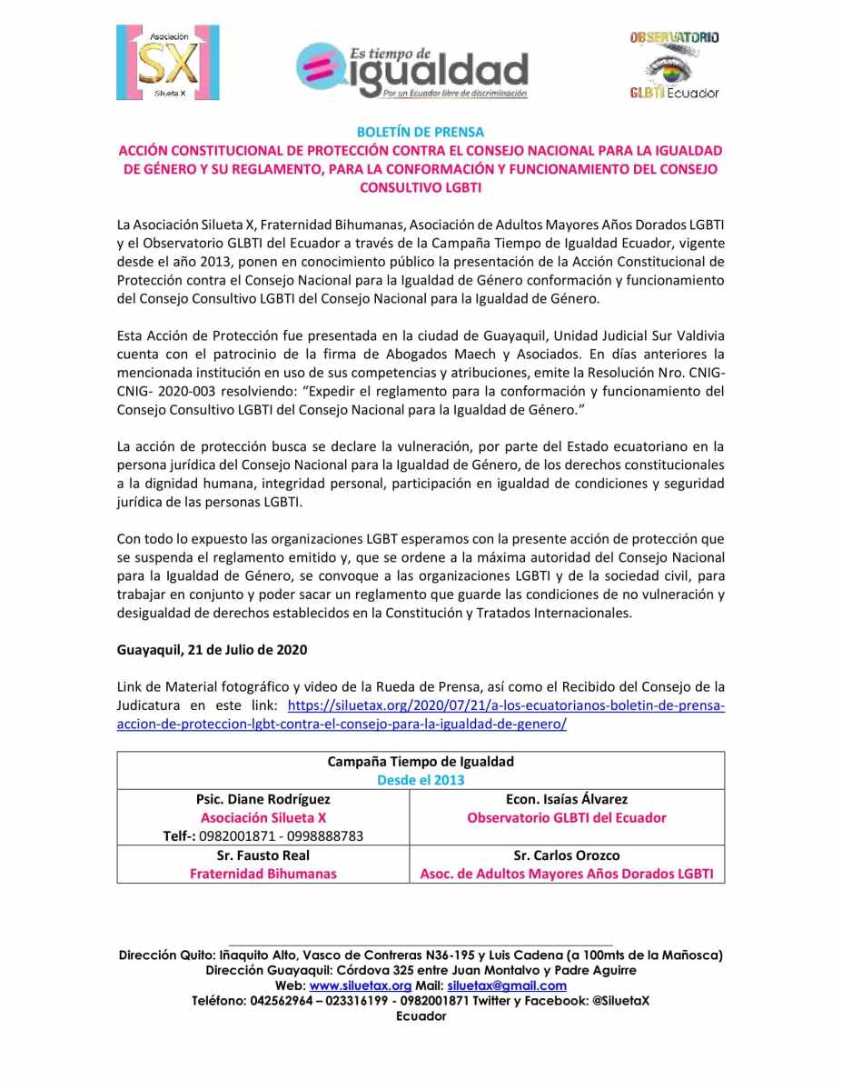 A LOS ECUATORIANOS, BOLETÍN DE PRENSA – ACCIÓN DE PROTECCIÓN LGBT CONTRA EL CONSEJO PARA LA IGUALDAD DE GÉNERO – Asociación Silueta X Publicado 21 julio, 2020 en 1700 × 2200 en A los ecuatorianos, BOLETÍN DE PRENSA – ACCIÓN DE PROTECCIÓN LGBT CONTRA EL CONSEJO PARA LA IGUALDAD DE GÉNERO ← Anterior