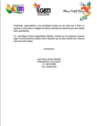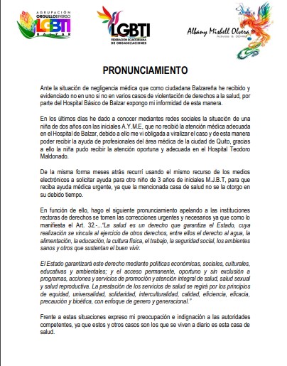 Fuente: Agrupación Orgullo Diverso LGBTI Balzar, Federación Ecuatoriana de Organizaciones LGBTI