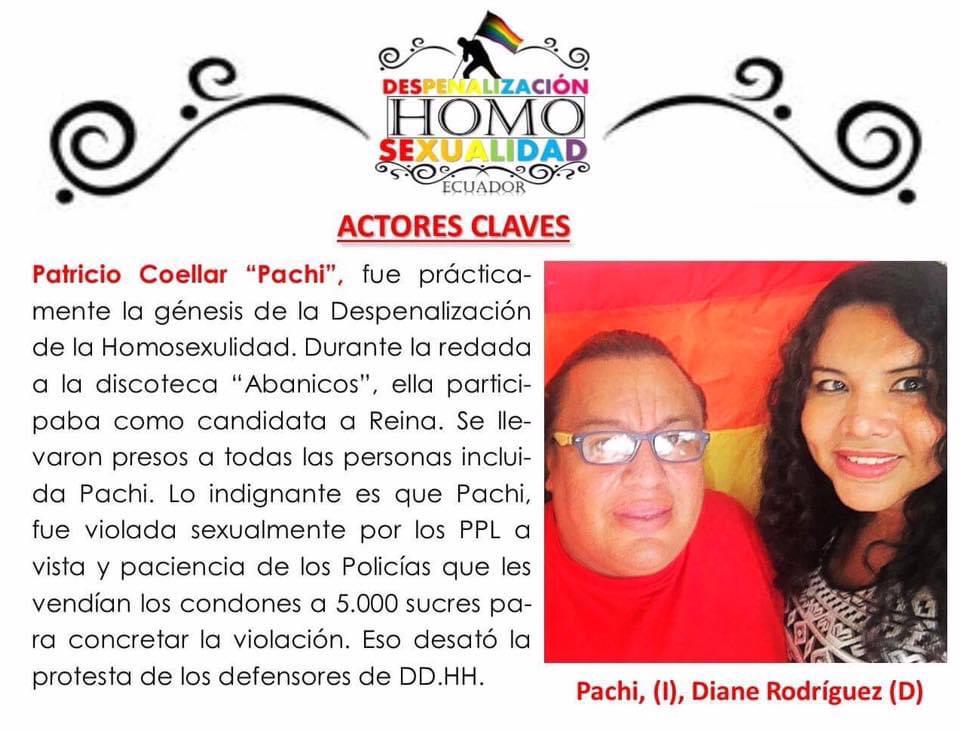 ACTORES CLAVES: Patricio Coellar “Pachi”, fue prácticamente la génesis de la Despenalización de la Homosexulidad. Durante la redada a la discoteca “Abanicos”, ella participaba como candidata a Reina. Se llevaron presos a todas las personas incluida Pachi. Lo indignante es que Pachi, fue violada sexualmente por los PPL a vista y paciencia de los Queridx Patricio reconocí tu lucha en la Campaña Despenalización de Silueta X. Hoy tu triste partida. Nos vemos allá donde los astros brillan, allá donde las estrellas cantan. que les vendían los condones a 5.000 sucres para concretar la violación. Eso desató la protesta de los defensores de DD.HH.