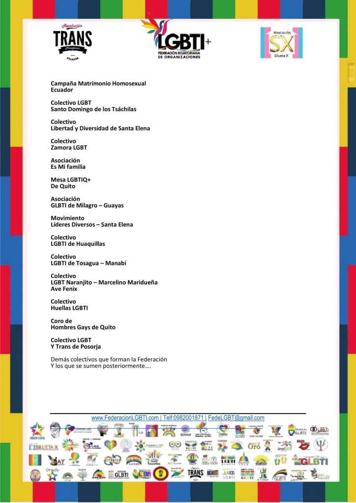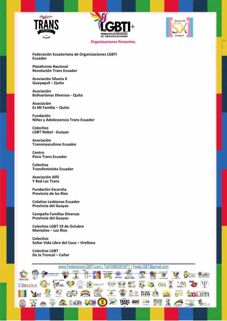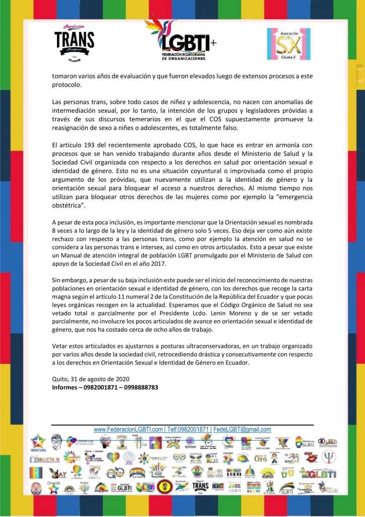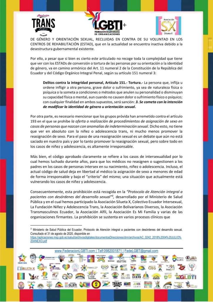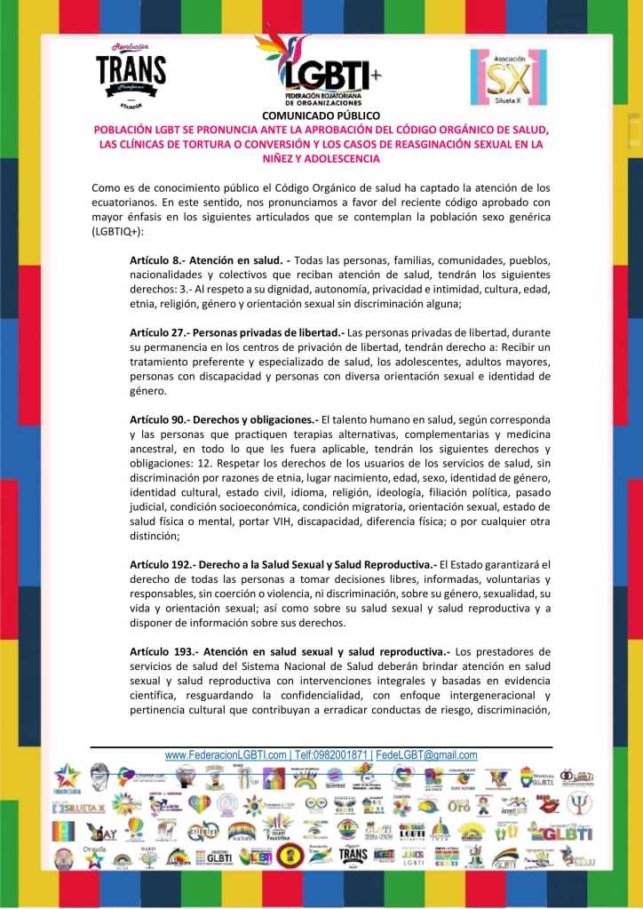POBLACIÓN LGBT SE PRONUNCIA ANTE LA APROBACIÓN DEL CÓDIGO ORGÁNICO DE SALUD, LAS CLÍNICAS DE TORTURA O CONVERSIÓN Y LOS CASOS DE REASGINACIÓN SEXUAL EN LA NIÑEZ Y ADOLESCENCIA
