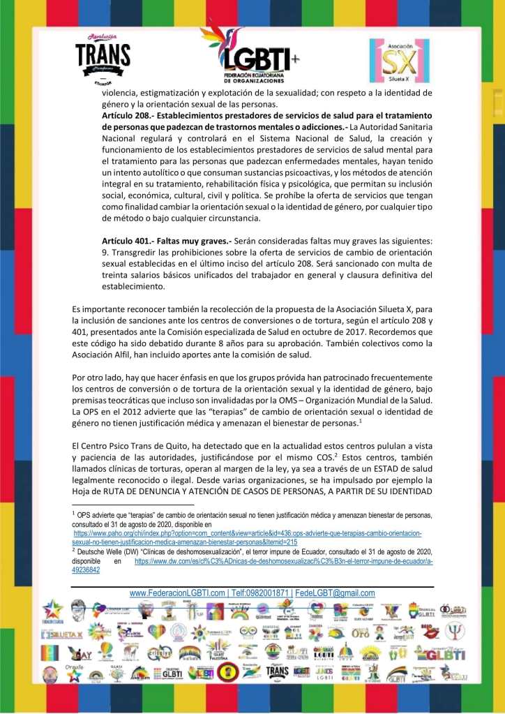 Como es de conocimiento público el Código Orgánico de salud ha captado la atención de los ecuatorianos. En este sentido, nos pronunciamos a favor del reciente código aprobado con mayor énfasis en los siguientes articulados que se contemplan la población sexo genérica (LGBTIQ+):