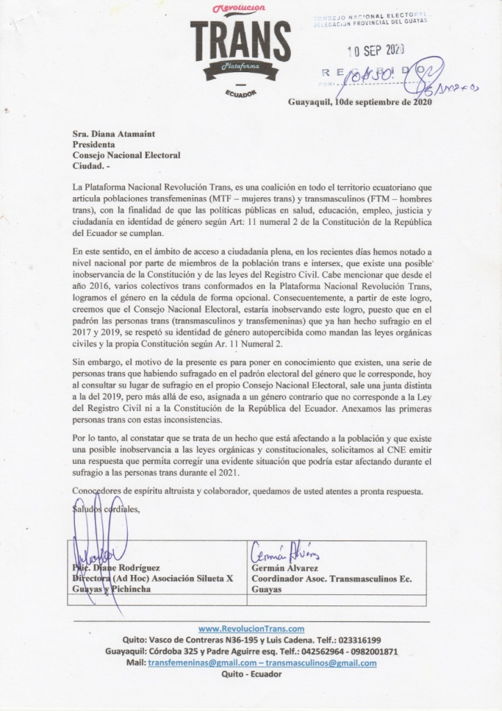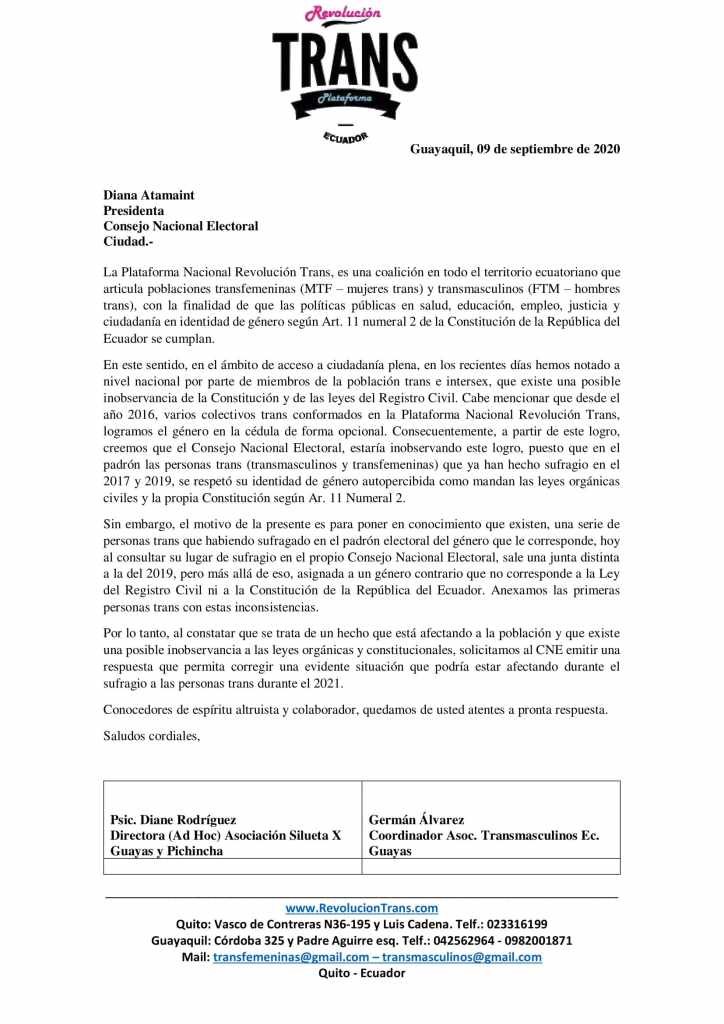 CARTA A LA PRESIDENTA DEL CNE DIANA ATAMAINT, SOBRE POSIBLE VULNERACIÓN A LA IDENTIDAD DE GÉNERO DE PERSONAS TRANS 10 septiembre, 2020 · de Anunciante · Añadir a marcadores el enlace permanente. · Carta a la Presidenta del CNE Diana Atamaint, sobre posible vulneración a la identidad de género de personas trans. Comparte esto: Haz clic para compartir en Facebook (Se abre en una ventana nueva) Facebook Haz clic para compartir en X (Se abre en una ventana nueva) X Haz clic para compartir en Telegram (Se abre en una ventana nueva) Telegram Haz clic para compartir en WhatsApp (Se abre en una ventana nueva) WhatsApp Relacionado