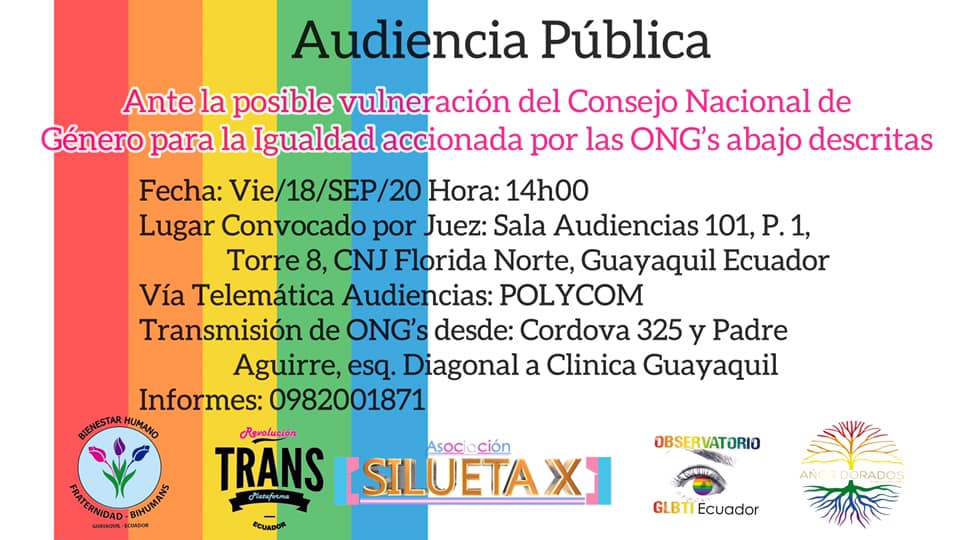 Accionan: Asociación Silueta X, Observatorio Ciudadano GLBTI del Ecuador, Fraternidad Bihumans, Asociación GLBTI Años Dorados, Plataforma Nacional Revolución Trans.