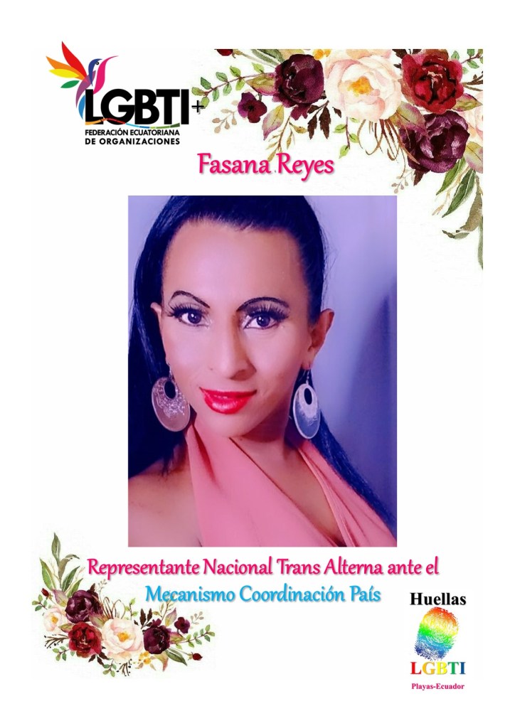 La Federación ecuatoriana de Organizaciones LGBT, comunica a sus organizaciones miembros que el día de ayer fue elegida, Fasana Rafaela Reyes Yagual, lideresa de Huellas Glbti Playas, como la Representante Nacional Alterna, ante el Mecanismo Coordinación Pais. La Representante principal es Itaty Vargas.