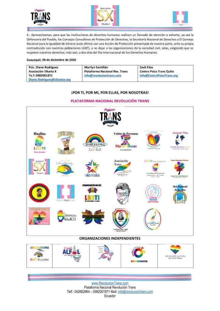 4.- Aprovechamos, para que las instituciones de derechos humanos realicen un llamado de atención o exhorto, ya sea la Defensoría del Pueblo, los Consejos Consultivos de Protección de Derechos, la Secretaría Nacional de Derechos y El Consejo Nacional para la Igualdad de Género (este último con una Acción de Protección presentada de nuestra parte, ante su propia contradicción con nuestras poblaciones LGBT), a no dejar a las organizaciones de la sociedad civil, solas, exigiendo que se respeten nuestros derechos; más aún, a dos días del Día Internacional de los Derechos Humanos.