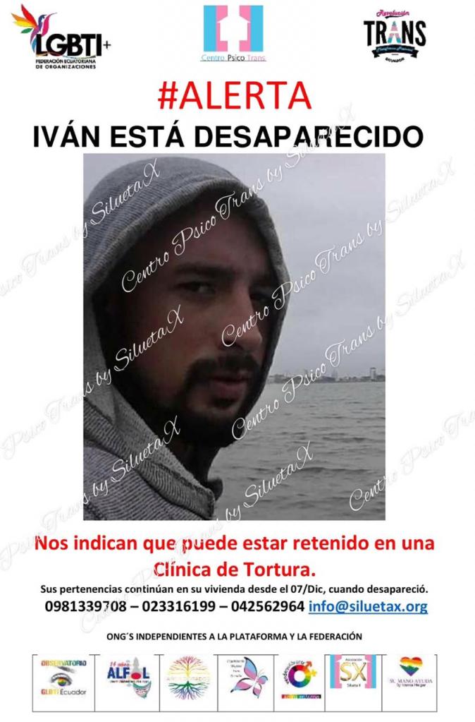 Nos indican que puede estar retenido en una Clínica de Tortura. Sus pertenencias continúan en su vivienda en Cuenca desde el 07/Dic, día en que desapareció. Cualquier información al 098-133-9708, 023316199, 042563964. Info@siluetax.org