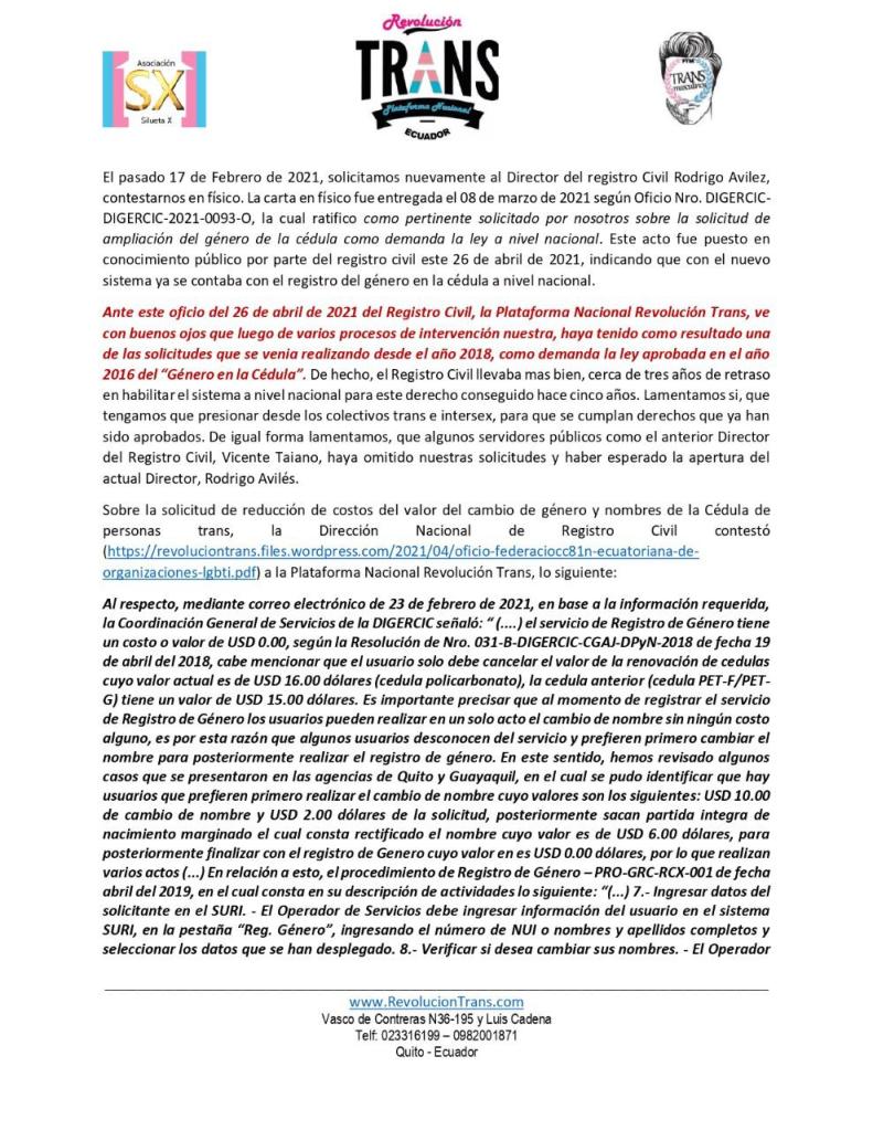 Ante este oficio del 26 de abril de 2021 del Registro Civil, la Plataforma Nacional Revolución Trans, ve con buenos ojos que luego de varios procesos de intervención nuestra, haya tenido como resultado una de las solicitudes que se venia realizando desde el año 2018, como demanda la ley aprobada en el año 2016 del “Género en la Cédula”.