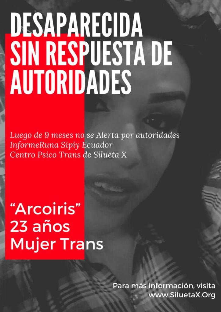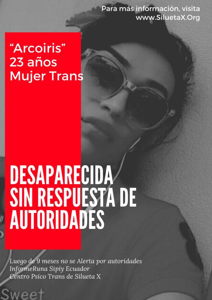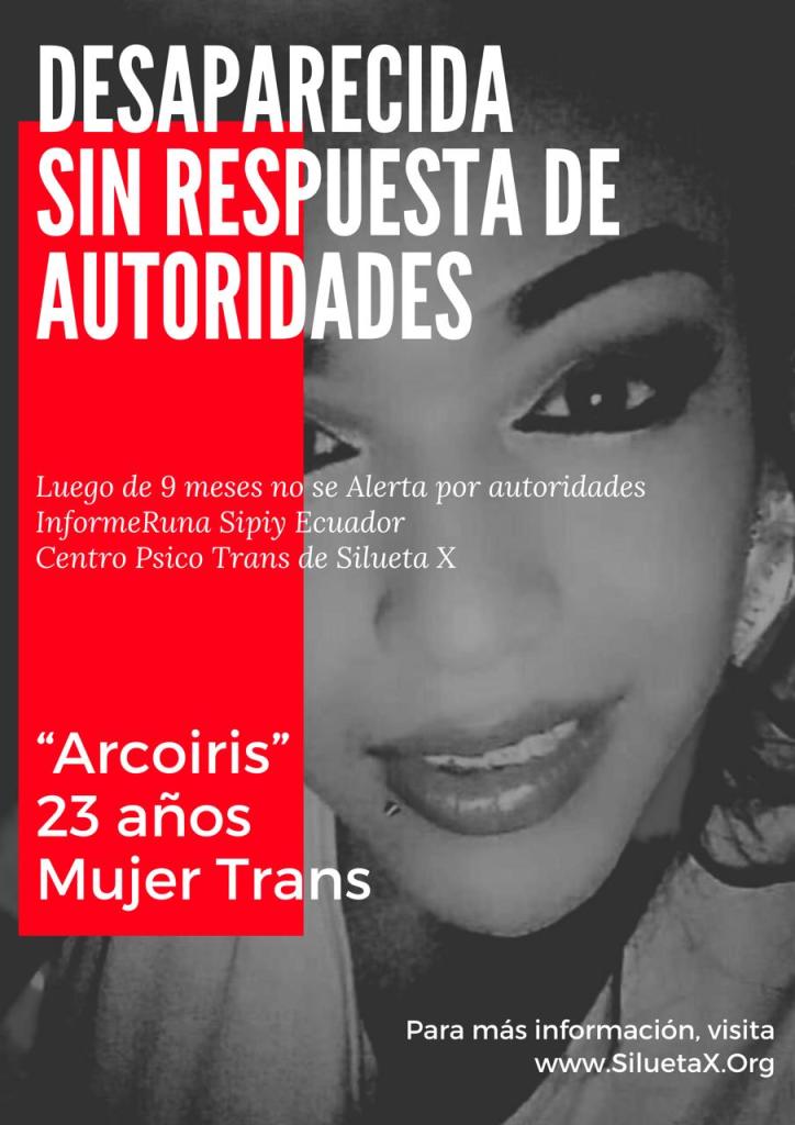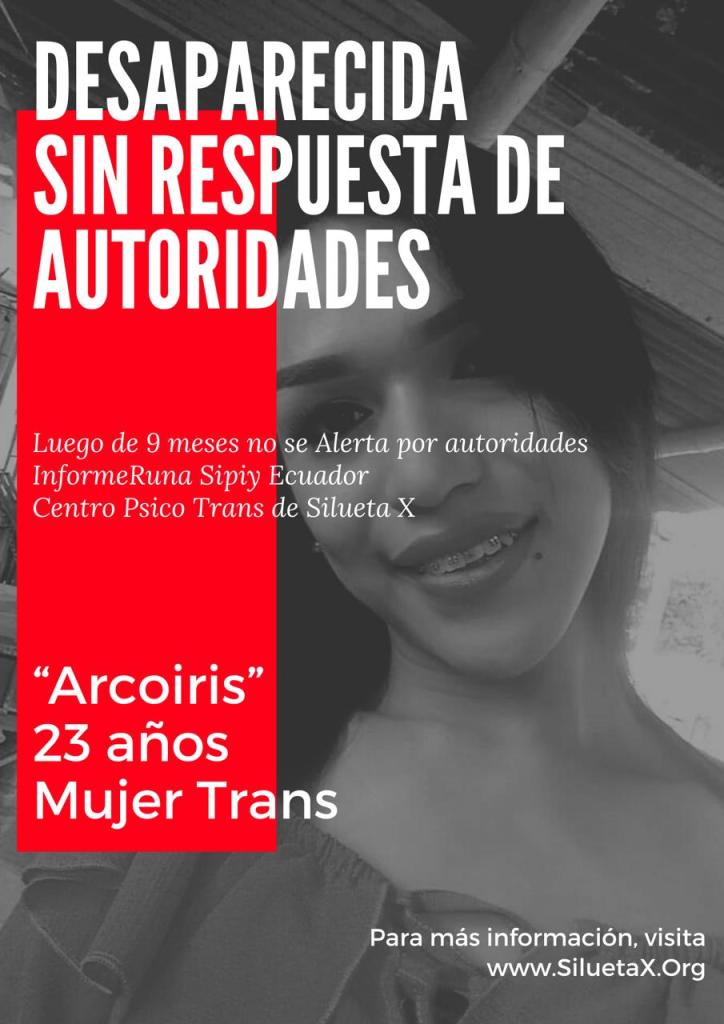 Hemos conocido a través de la Fundación Escarcha de Babahoyo que la joven trans conocida como Arcoíris Alvarado Quijije (Ignacio Alberto) de 23 años oriunda de Pueblo Viejo, desapareció el 27 de septiembre de 2020.