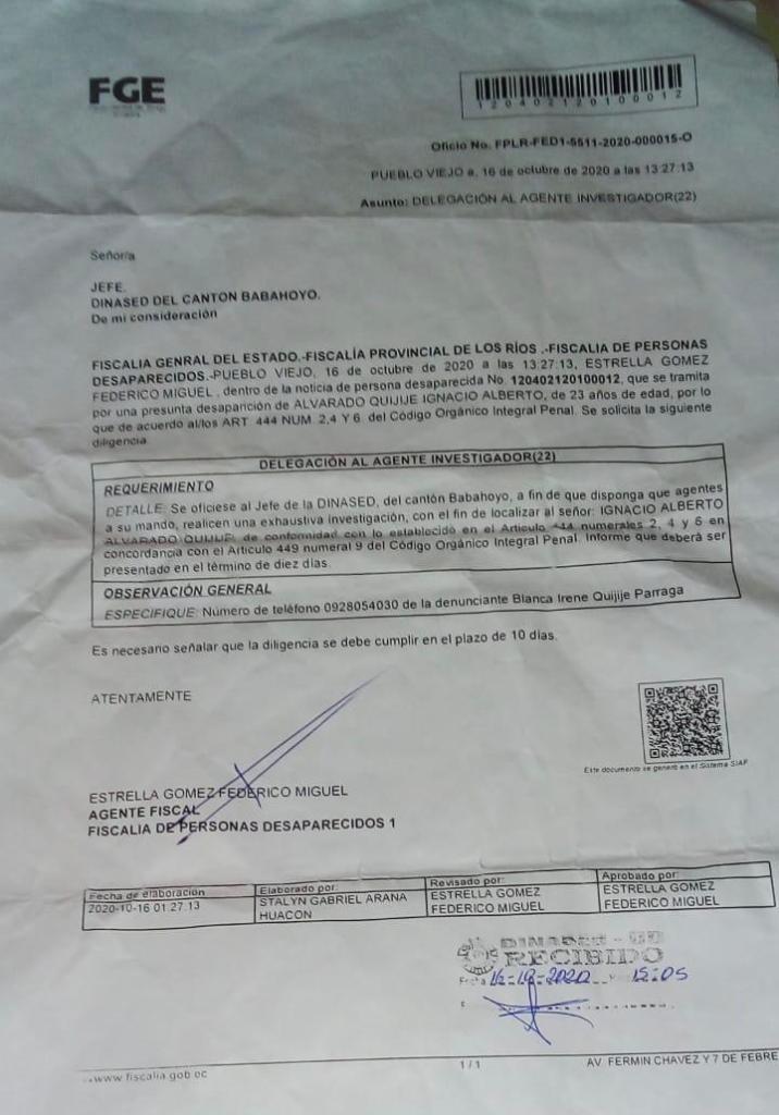 La denuncia de su desaparición ha sido presentada por sus familiares, sin embargo, no hay respuesta positiva del proceso o de su avance y adicional, no ha sido enviada la alerta de su desaparición a través de los mecanismos habituales de la policía nacional.