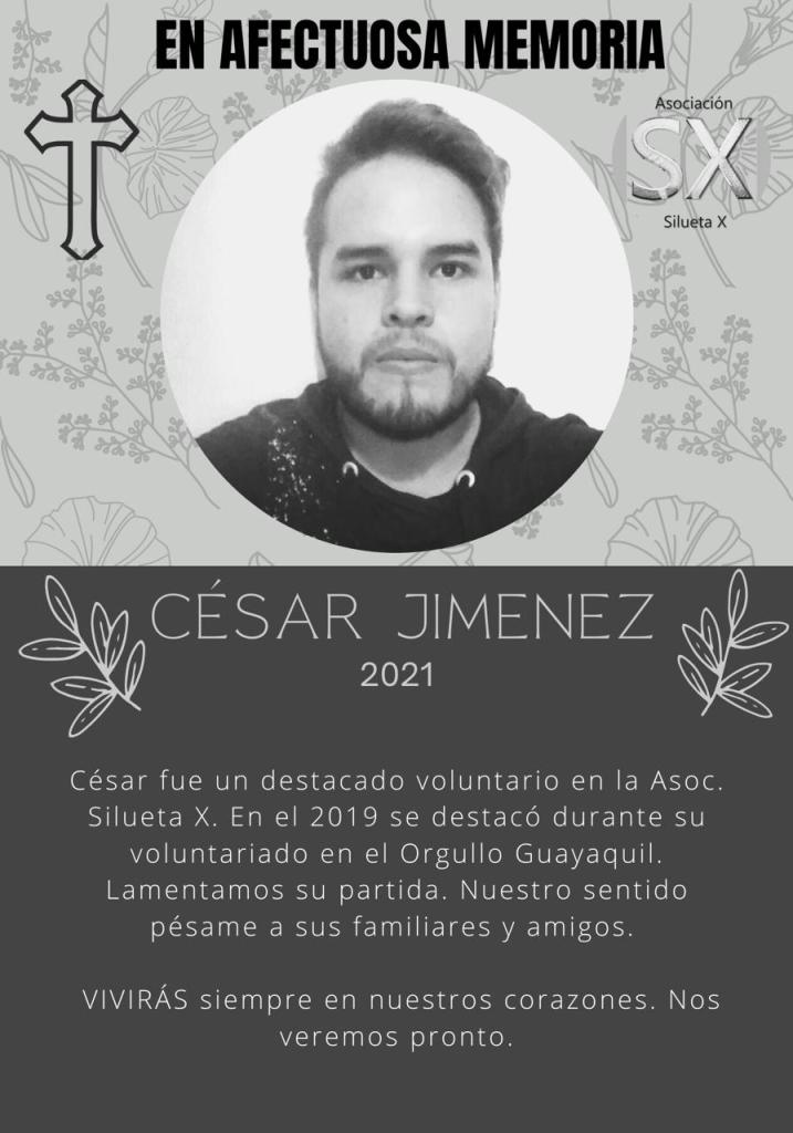César fue un destacado voluntario en la Asoc. Silueta X. En el 2019 se destacó durante su voluntariado en el Orgullo Guayaquil. Lamentamos su partida. Nuestro sentido pésame a sus familiares y amigos.