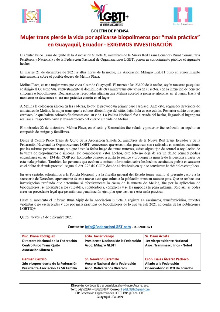 El Centro Psico Trans de Quito de la Asociación Silueta X, miembros de la Nueva Red Trans Ecuador (Rural Comunitaria Periférica y Nacional) y de la Federación Nacional de Organizaciones LGBT, ponen en conocimiento público el siguiente hecho: