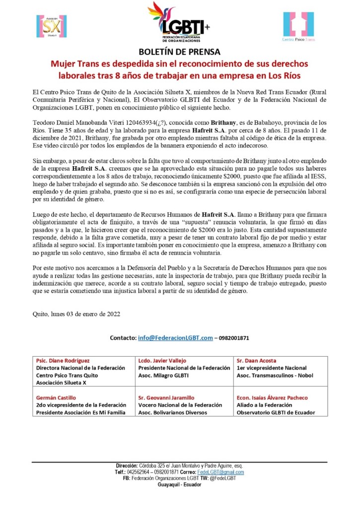 El Centro Psico Trans de Quito de la Asociación Silueta X, miembros de la Nueva Red Trans Ecuador (Rural Comunitaria Periférica y Nacional), El Observatorio GLBTI del Ecuador y de la Federación Nacional de Organizaciones LGBT, ponen en conocimiento público el siguiente hecho.