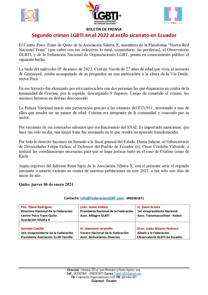 El Centro Psico Trans de Quito de la Asociación Silueta X, miembros de la Plataforma “Nueva Red Nacional Trans” (que cubre con sus colectivas lo rural, comunitario, las periferias), el Observatorio GLBTI, y de la Federación Nacional de Organizaciones LGBT, ponen en conocimiento público el siguiente hecho.