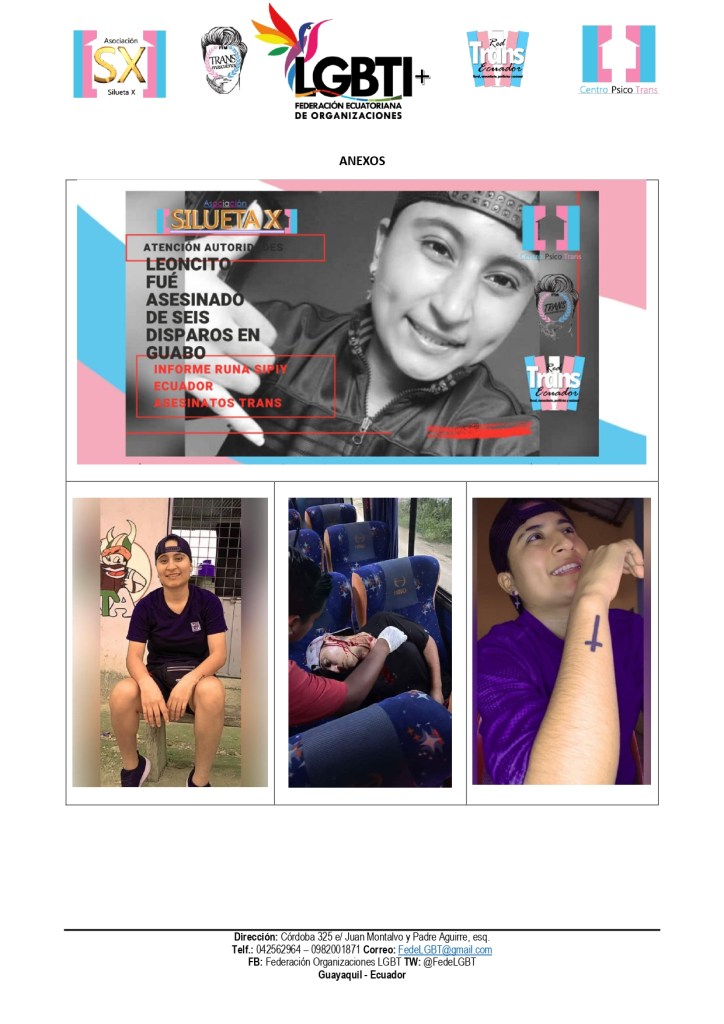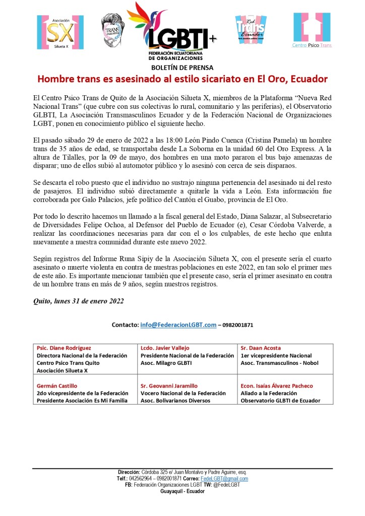 El Centro Psico Trans de Quito de la Asociación Silueta X, miembros de la Plataforma “Nueva Red Nacional Trans” (que cubre con sus colectivas lo rural, comunitario y las periferias), el Observatorio GLBTI, La Asociación Transmasculinos Ecuador y de la Federación Nacional de Organizaciones LGBT, ponen en conocimiento público el siguiente hecho.