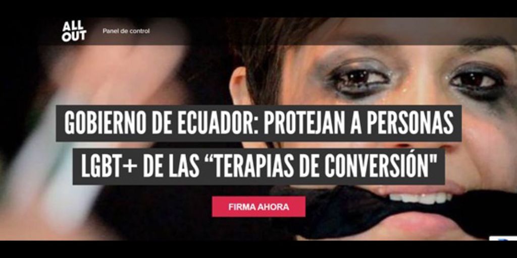 Las terapias de conversión y dichos centros siguen proliferando en Ecuador. En este sentido ponemos en conocimiento público que hemos iniciado una campaña para que la secretaria de Derechos Humanos active el Protocolo de intervención en casos de terapias de conversión por identidad de género y orientación sexual. Para tales efectos, solicitamos que se firme la solicitud en All Out y adicional lo compartan: