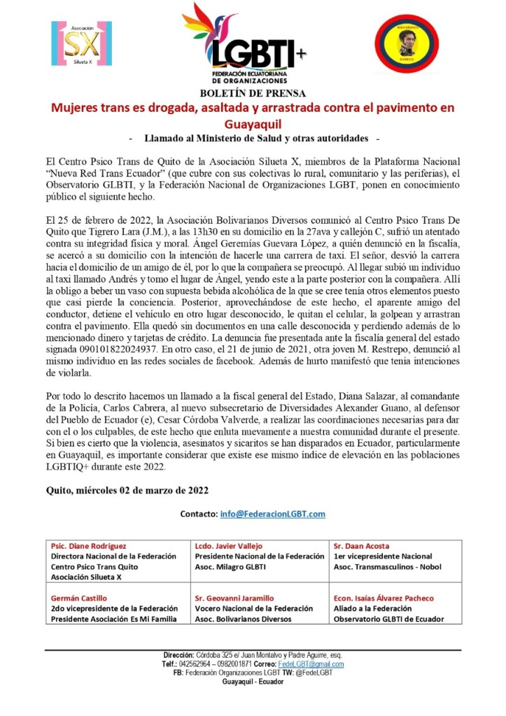 El Centro Psico Trans de Quito de la Asociación Silueta X, miembros de la Plataforma Nacional “Nueva Red Trans Ecuador” (que cubre con sus colectivas lo rural, comunitario y las periferias), el Observatorio GLBTI, y la Federación Nacional de Organizaciones LGBT, ponen en conocimiento público el siguiente hecho.