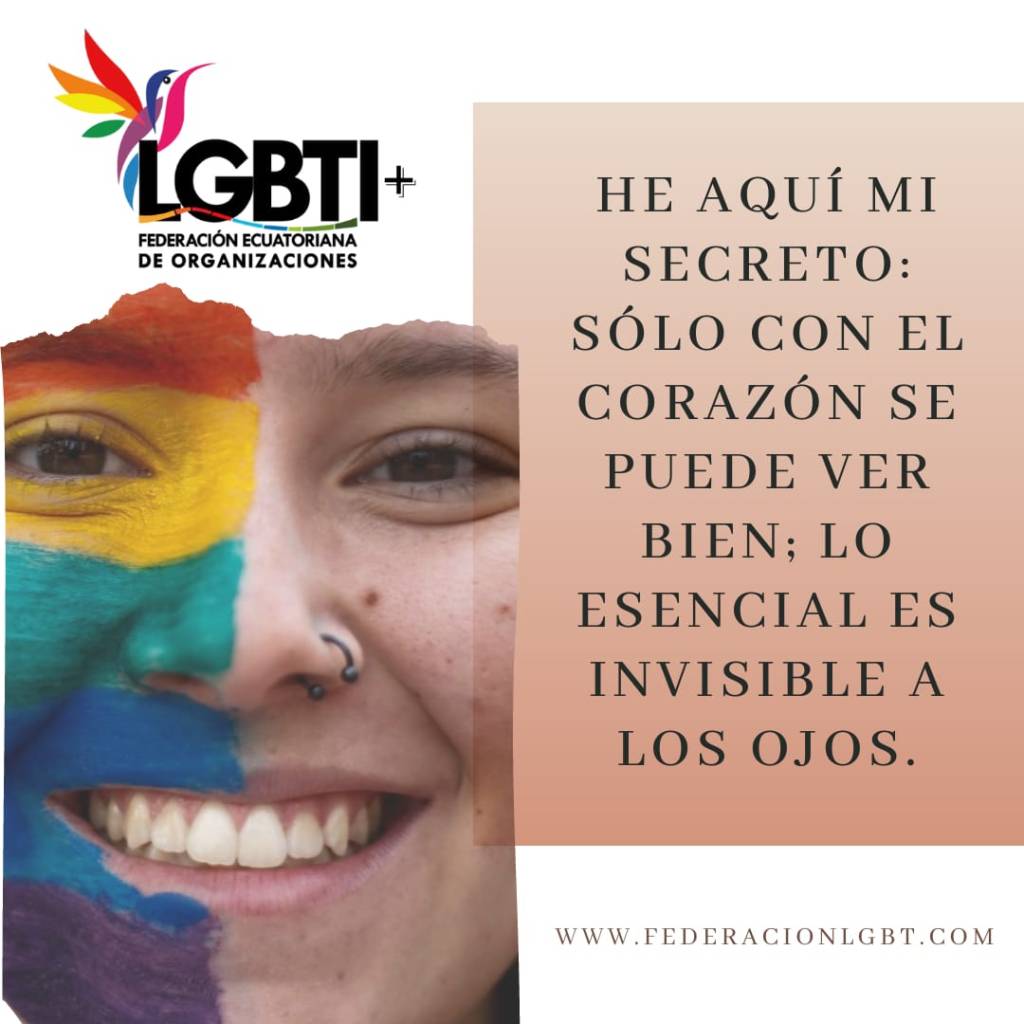 He aquí mi secreto:Sólo con el corazón se puede ver bien; lo esencial es invisible a los ojos. 2 marzo, 2022 · de Moderador · Añadir a marcadores el enlace permanente. · #FederacionLGBTEcuador #FederadosLGBTIEcuador #SomosFederadosLGBTIQ+ Www.federacionlgbt.com Comparte esto: Haz clic para compartir en Facebook (Se abre en una ventana nueva) Facebook Haz clic para compartir en X (Se abre en una ventana nueva) X Haz clic para compartir en Telegram (Se abre en una ventana nueva) Telegram Haz clic para compartir en WhatsApp (Se abre en una ventana nueva) WhatsApp Relacionado