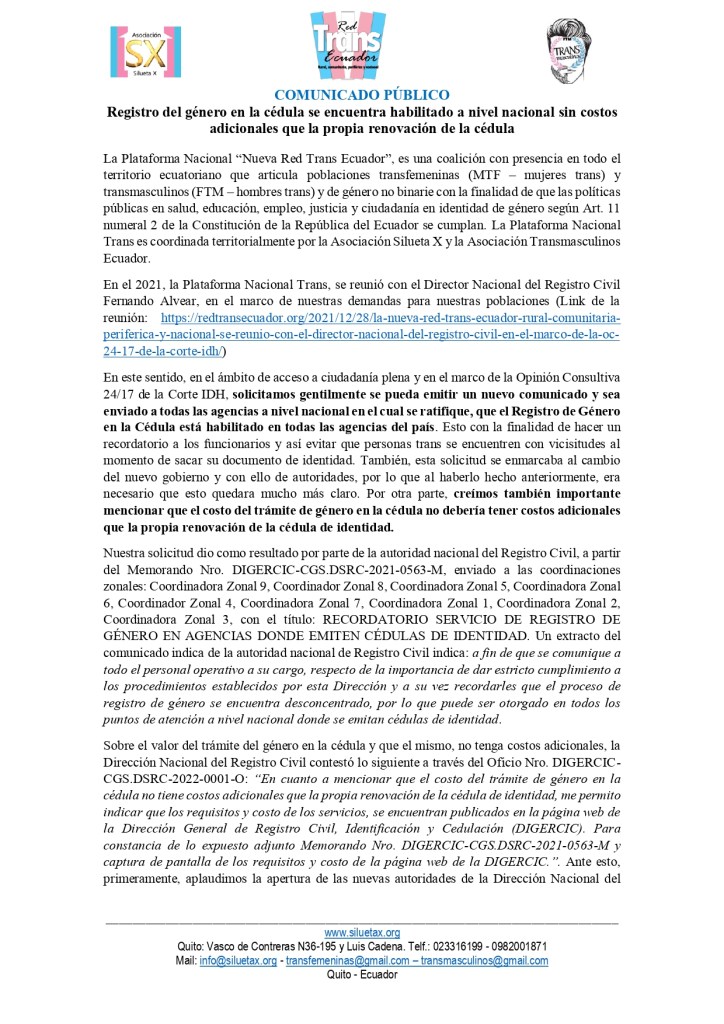 En el 2021, la Plataforma Nacional Trans, se reunió con el Director Nacional del Registro Civil Fernando Alvear, en el marco de nuestras demandas para nuestras poblaciones (Link de la reunión: https://redtransecuador.org/2021/12/28/la-nueva-red-trans-ecuador-rural-comunitaria-periferica-y-nacional-se-reunio-con-el-director-nacional-del-registro-civil-en-el-marco-de-la-oc-24-17-de-la-corte-idh/)