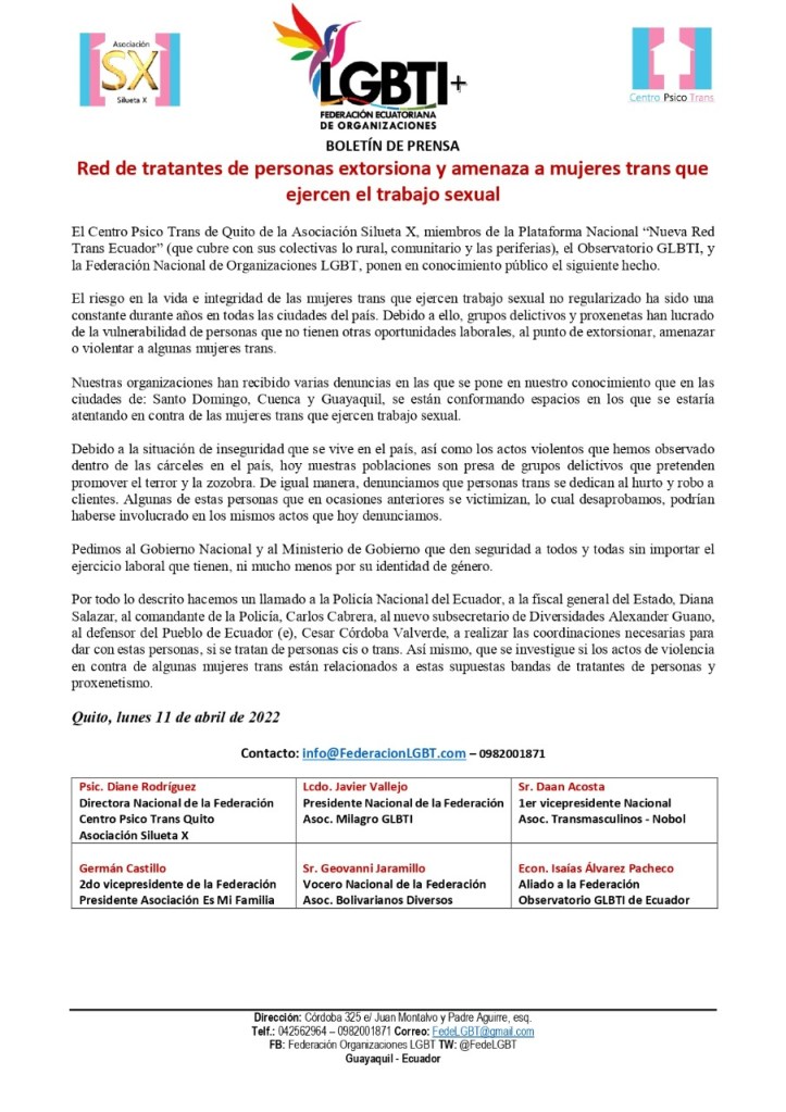 El Centro Psico Trans de Quito de la Asociación Silueta X, miembros de la Plataforma Nacional “Nueva Red Trans Ecuador” (que cubre con sus colectivas lo rural, comunitario y las periferias), el Observatorio GLBTI, y la Federación Nacional de Organizaciones LGBT, ponen en conocimiento público el siguiente hecho.