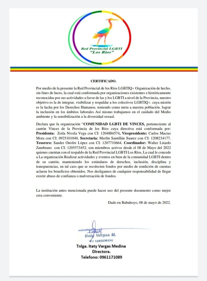 Luego de cumplir con los requisitos adquiridos como evidencia de trabajo con la Comunidad LGBTI, publicación de invitación a reunión y rendición de cuentas, Nosotros Como Red Provincia de los Ríos Respaldamos a la Organización.