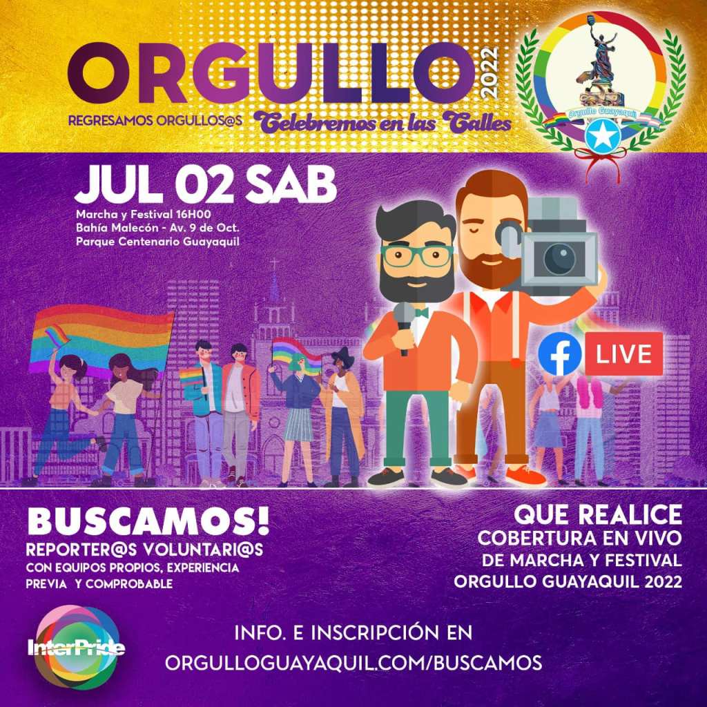 Buscamos REPORTEROS VOLUNTARIOS LGBT+ con equipos propios, experiencia previa y comprobable para cobertura durante #OrgulloGuayaquil.